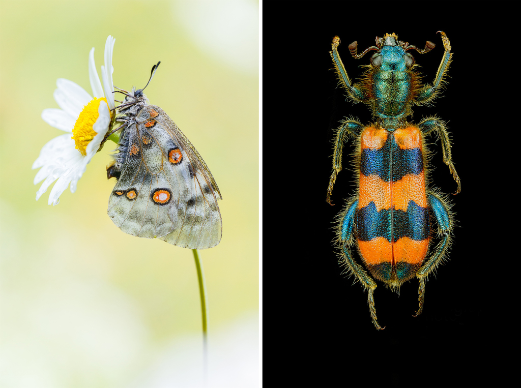 links: Roter Apollo (Parnassius apollo), rechts: Gemeiner Bienenkäfer (Trichodes apiarius) © Patrick Henschke